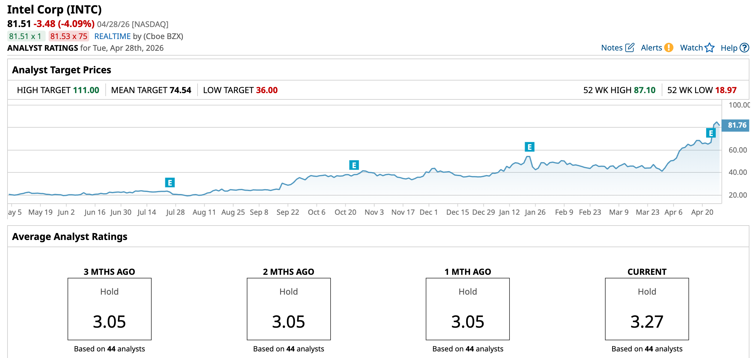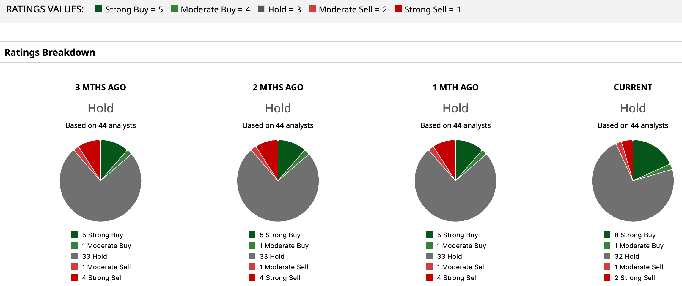 According to the latest data, the consensus rating remains “Hold," with 44 analysts reporting.