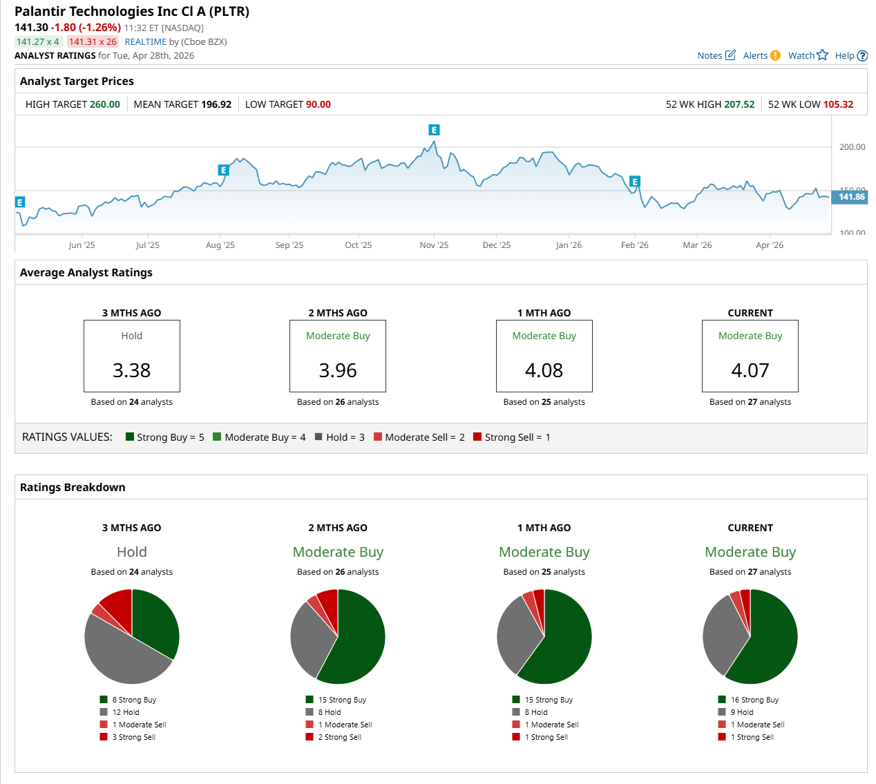 On Apr. 28, Citigroup Inc. (C) maintained a “Buy” rating on PLTR but lowered its price target to $210, indicating a 48.6% potential upside from the current levels.