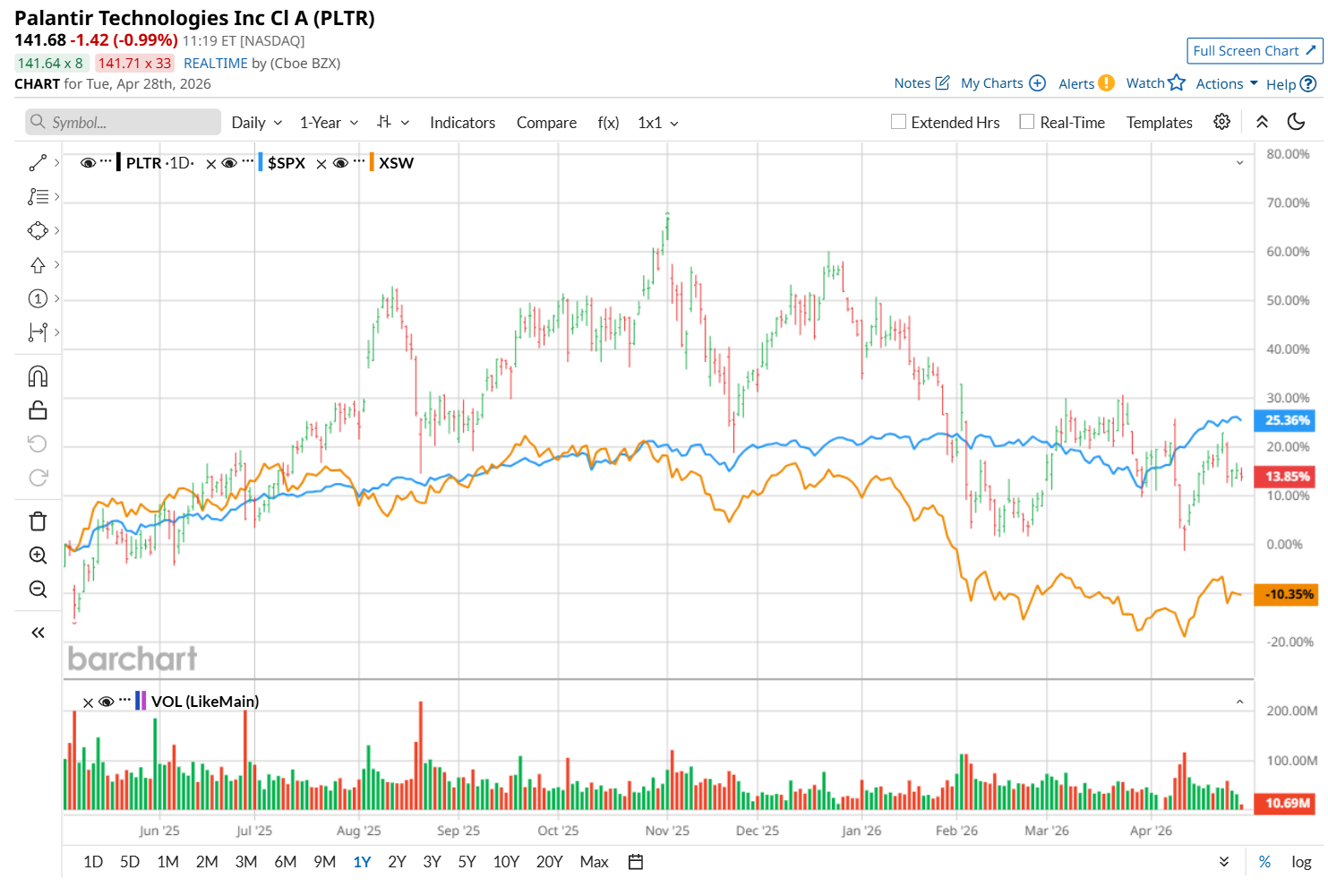 Zooming in further, PLTR has outpaced the SPDR S&P Software & Services ETF’s (XSW) 7.3% loss over the past 52 weeks. However, it has slightly trailed XSW’s 19.2% YTD drop.