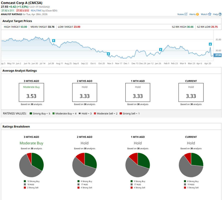 The mean price target of $33.76 represents a 20.9% premium to CMCSA’s current price levels. The Street-high price target of $53 suggests a 89.8% potential upside.