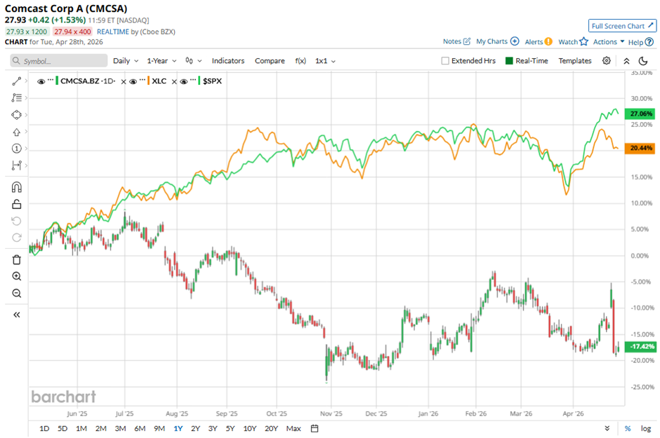 Shares of Comcast have underperformed the broader market over the past 52 weeks. CMCSA stock has decreased 17.7% over this time frame, while the broader S&P 500 Index ($SPX) has rallied 28.9%. In addition, shares of Comcast are down nearly 7% on a YTD basis, compared to SPX’s 4.1% rise.