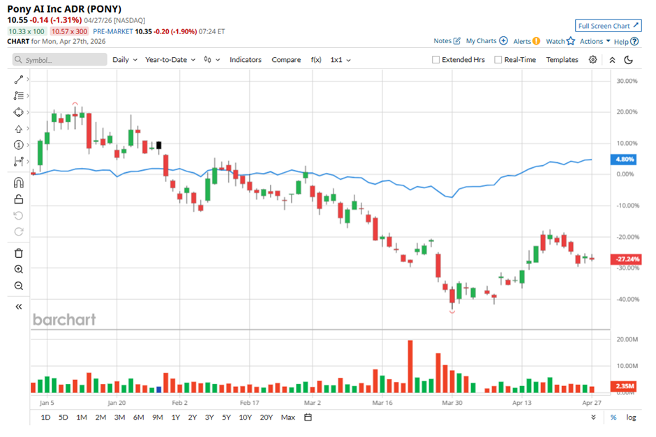 Currently valued at $4.1 billion by market capitalization, Pony AI made its Nasdaq debut in 2024, and while the stock has slipped marginally over the past year, it has stumbled 29.28% in 2026 so far, pressured by mixed quarterly results, lingering profitability concerns, and ongoing U.S.-China tensions.