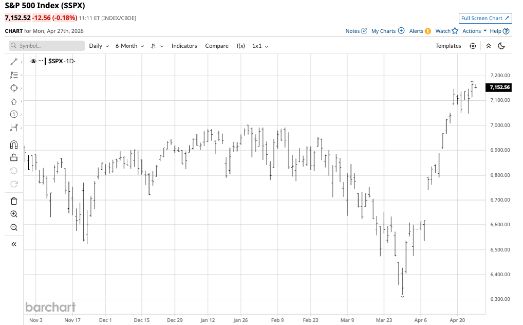 Gold was trading near $4,350 per ounce in late December, with the S&P 500 index just below 6,900. On April 27, 2026, gold was near $4,700 per ounce after reaching a high of $5,626.80, and the S&P 500 was above 7,150.