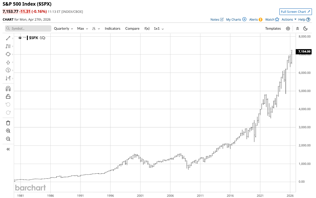 The ongoing war in Ukraine, hostilities in the Middle East, rising U.S. debt, concerns about consumer debt and bank loans, and U.S. political division have not prevented the bull market in stocks from charging higher. The S&P 500 index, the most diversified U.S. stock market index, fell in Q1 2026 but recovered, rising above 7,000 and reaching a new all-time high in April 2026.