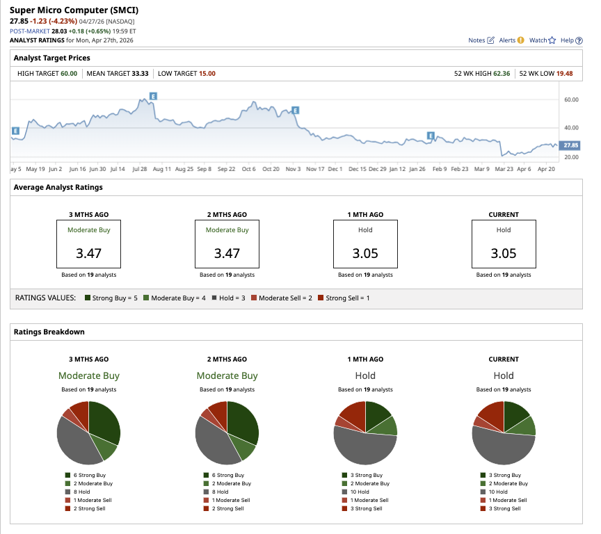 Nonetheless, Wall Street remains cautiously optimistic about SMCI stock. Of the 19 analysts who cover the stock, three rate it a “Strong Buy,” two say it is a “Moderate Buy,” 10 rate it a “Hold,” one says it is a “Moderate Sell,” and three say it is a “Strong Sell.” The stock’s average price target of $33.33 indicates a 20% increase from current levels. Meanwhile, the Street-high estimate of $60 suggests a potential 115% jump over the next 12 months.