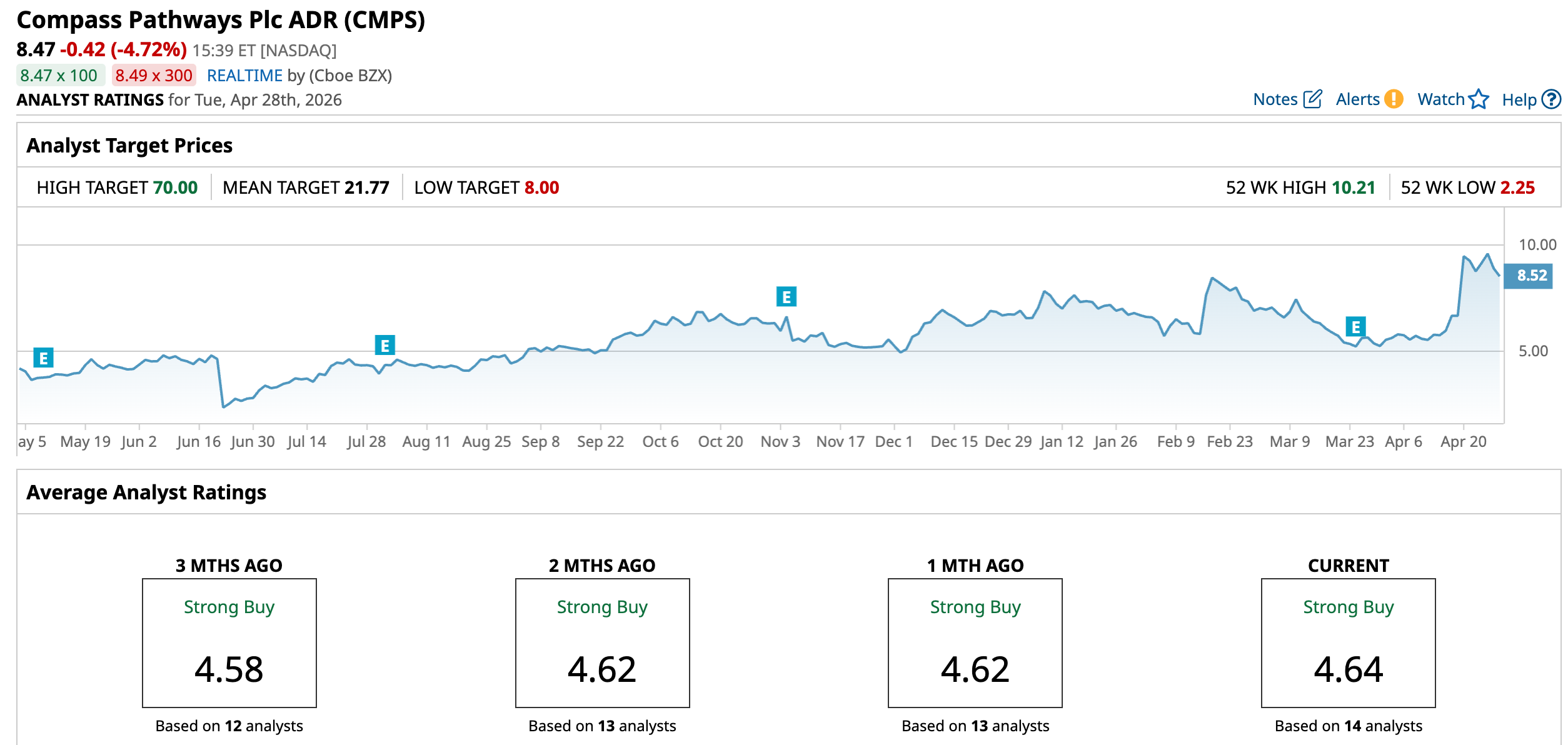 The market has shown an optimistic view on COMP360 psilocybin therapy, including the news of the late-stage trial data. Over the past 52 weeks, the stock has gained 121.39%, while it has been up 24.49% year-to-date (YTD). After CMPS reached its 52-week high of $10.21 on April 20, Wall Street has backed off, and the stock is down 17% from that level.