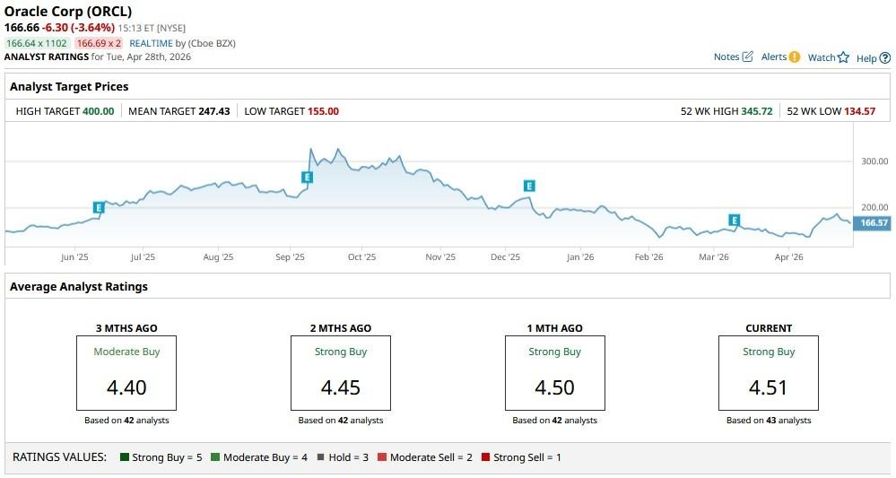 It's also worth mentioning that Wall Street expects Oracle to rip much higher from here over the next 12 months.