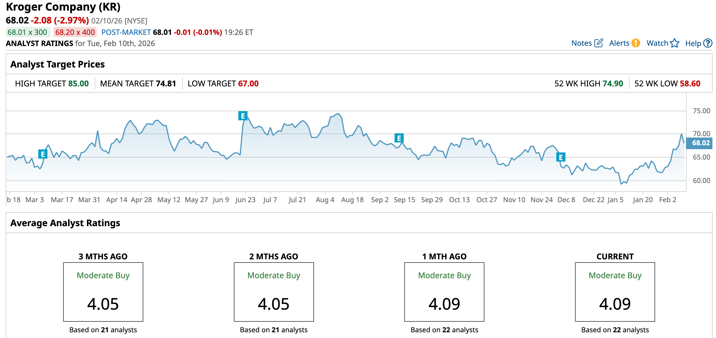 Telsey Advisory Group, led by analyst Joseph Feldman, has reiterated an “Outperform” rating on KR stock and maintained an $80 price target, signaling steady conviction in Kroger’s fundamentals.