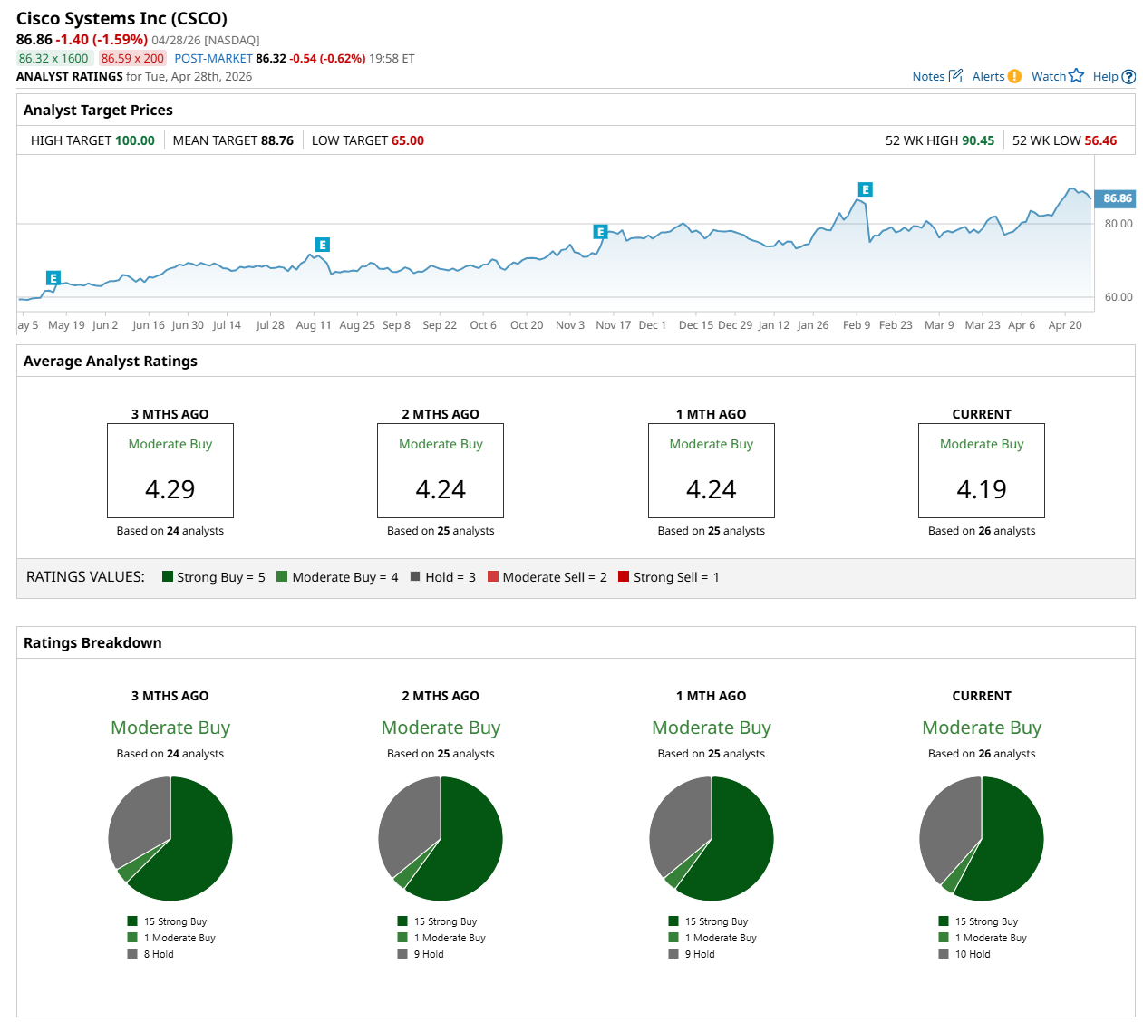 On Apr. 17, Amit Daryanani from Evercore Inc. (EVR) maintained a “Buy” rating on Cisco Systems, with a price target of $100, the Street-high price target, indicating a 15.1% potential upside from the current levels.