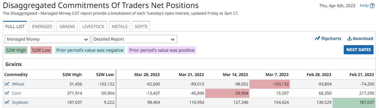 The soybean COT report demonstrates the bullishness of managed money (blue) by remaining net long (more long positions than short) soybeans for the past year. The October rally shows managed money adding to their current long positions until they peaked in February. At that time, they had more long positions than in the past 52 weeks, usually a time to expect some long liquidation.Â