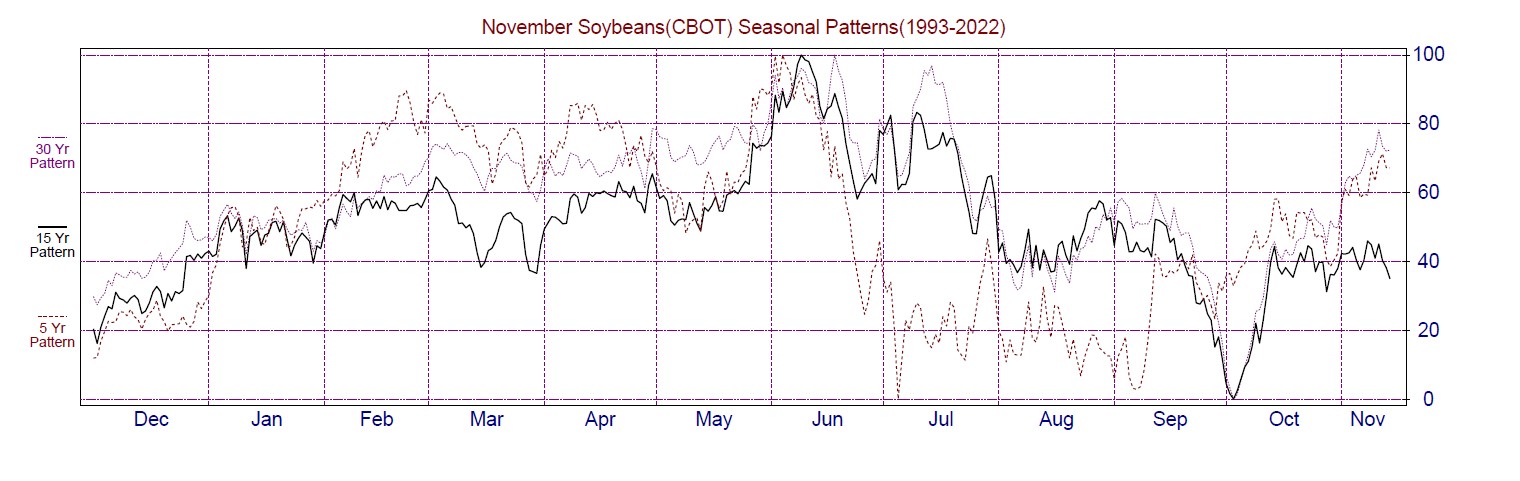 MRCI research illustrates that the 15-year new crop soybean pattern (black) tends to rally in April but has some sideways action until mid-May when the pattern reveals a significant rally into June. By June, producers will have planted their crops and anxiously await a price rally as the potential one in May, to sell futures contracts to hedge this year's crop. Currently, the soybean market is in backwardation, near months priced higher than back months, which could create some issues for hedgers wanting to sell the new crop month, November futures.Â