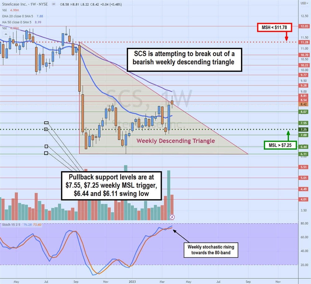 A descending triangle pattern comprises lower highs on bounces and flat lows on drops. The flat low is the triangle's lower trendline, and the lower highs make up the triangles falling trend line. SCS started its weekly triangle upon triggering the weekly market structure high (MSH) breakdown under $11.78. Shares fell to a low of $6.11 in December 2022 before staging a rally back up through the weekly market structure low (MSL) buy trigger at $7.25.
