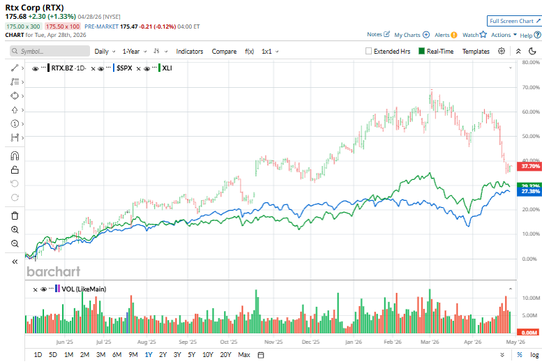 Shares of the defense titan have significantly outperformed the broader market over the past 52 weeks. RTX stock has jumped 40.8% over this time frame, while the broader S&P 500 Index ($SPX) has rallied 29.1%. However, RTX shares are down 4.2% on a YTD basis, compared to SPX’s 4.3% rise.