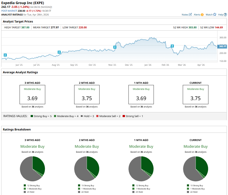 On April 14, 2026, Wells Fargo reiterated its “Equal-Weight” rating on Expedia, while slightly trimming the price target from $311 to $310.