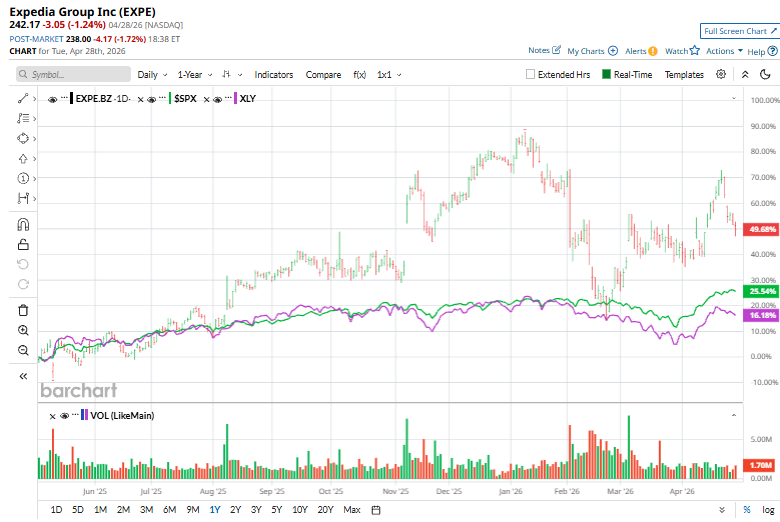 Shares of the company have outperformed the broader market over the past 52 weeks. EXPE stock has climbed 50.2% over this time frame, while the broader S&P 500 Index ($SPX) has rallied 29.1%. However, shares of Expedia are down 14.5% on a YTD basis, lagging behind SPX’s 4.3% return.