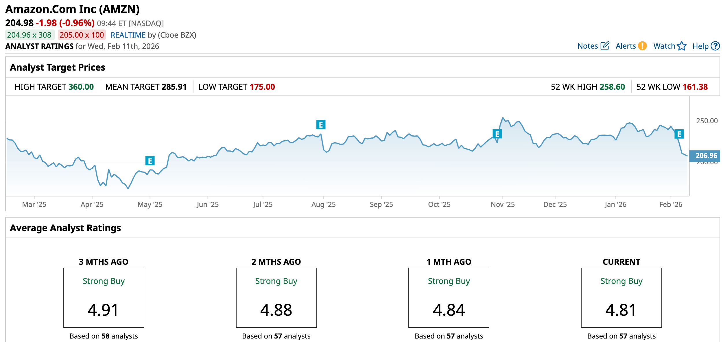 The average analyst price target for AMZN is $285.91, indicating a potential upside of 39.5%. The Street-high target price of $360 suggests that the stock could rally as much as 75.6%.