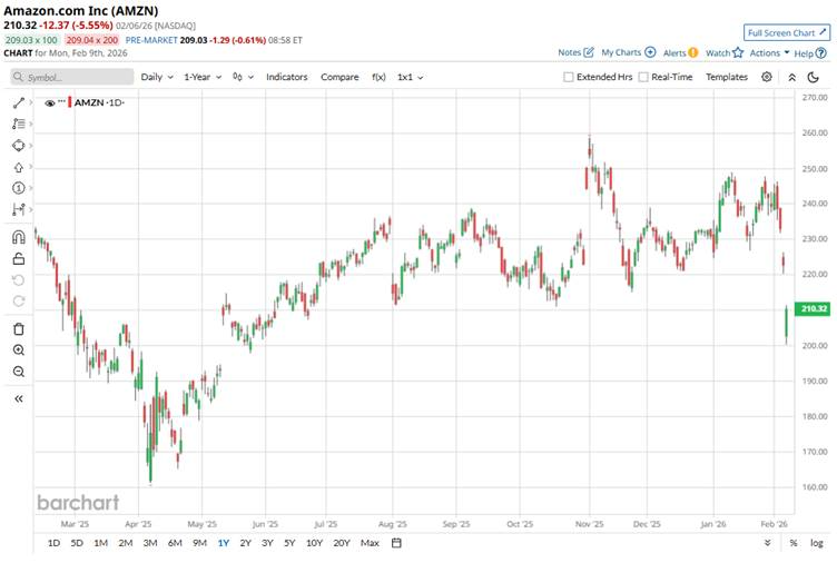 The year-to-date (YTD) picture in 2026 has followed a similar trend, with Amazon’s stock again recording a notable decline, down 9.47%. This negative movement has been driven in large part by a significant market sell-off linked to the company’s 2026 capital expenditure guidance, which far exceeded expectations. Investors reacted strongly when Amazon announced plans to spend around $200 billion on AI, cloud, robotics, and data-center infrastructure, a figure that eclipsed consensus forecasts and raised concerns about near-term free-cash‐flow erosion and profitability headwinds.