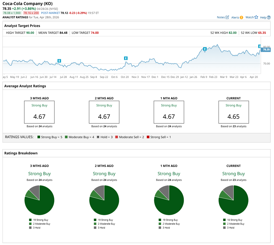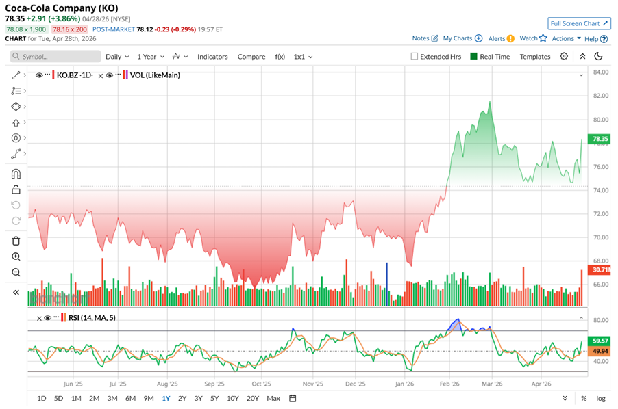 The steady strength of the Coca-Cola Company is showing up clearly on the charts, too. KO stock has climbed 9% over the past 52 weeks, with a 15% run just in the last six months. And in 2026, it is off to a strong start, with shares up 13% on a year-to-date (YTD) basis, notching fresh highs 22 times and even reaching $82 back in February.