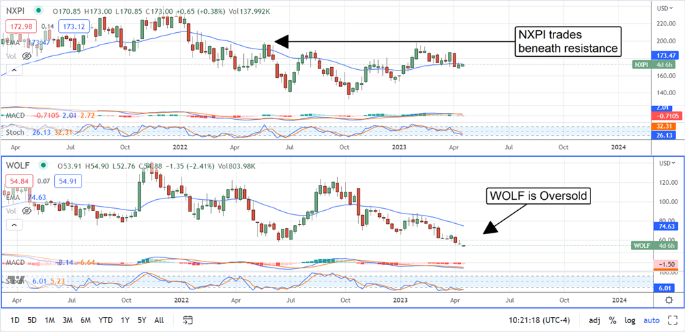 With the chip stocks expected to begin reporting soon, the sector is coming into focus, and Wells Fargo (NYSE: WFC) just announced its 2 top picks. Analysts Gary Mobley chooses NXP Semiconductors (NASDAQ: NXPI) and Wolfspeed (NASDAQ: WOLF) for differing reasons. In his view, NXP Semiconductor shares lag behind the broader semiconductor industry because the analysts' consensus is too pessimistic about the 2nd half of the year and all of next year.