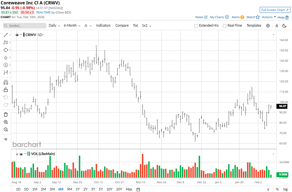 CoreWeave's stock has been volatile amid AI hype, gaining over 8% in the past week and 11% in the past month. Year-to-date (YTD), it's soared 25% from $73 lows while being 22% off its high of $114 set in late January. Despite this, CRWV stock lags in the medium term as it is flat in three months but down 36% in six months time.