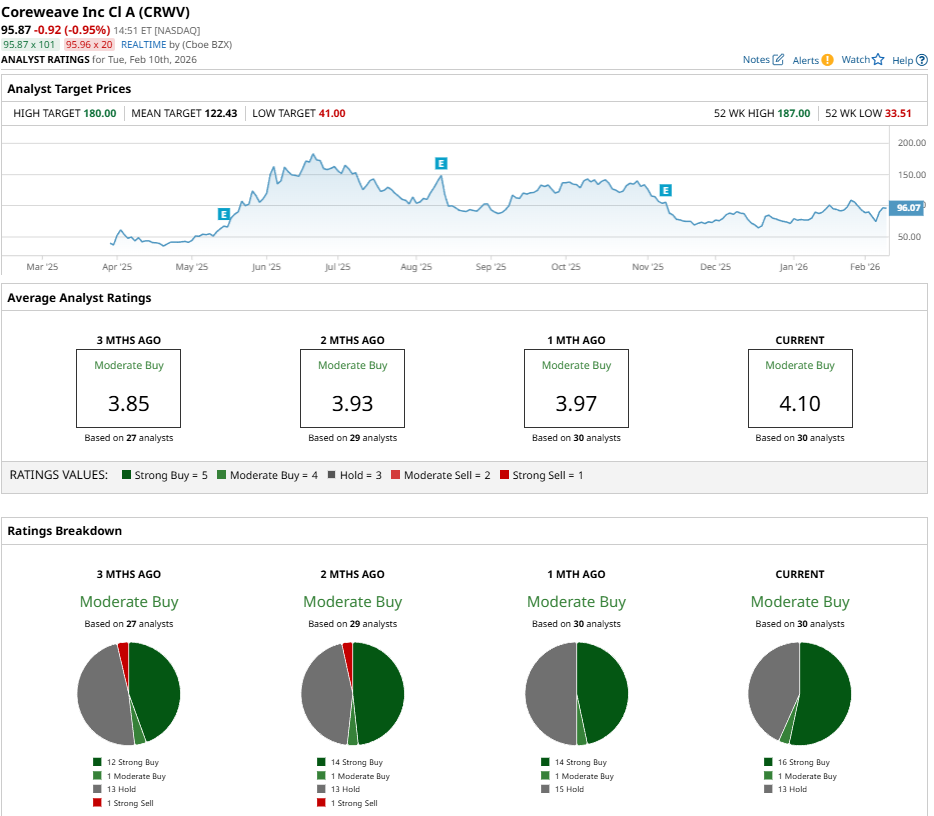 Amid the upcoming results, analysts have a consensus “Moderate Buy” rating on CRWV stock with a mean price target of $122.43, reflecting an upside potential of 28% from the market rate. The stock has been rated by 30 analysts, receiving 16 “Strong Buy” ratings, one “Moderate Buy” rating, and 13 “Hold” ratings.