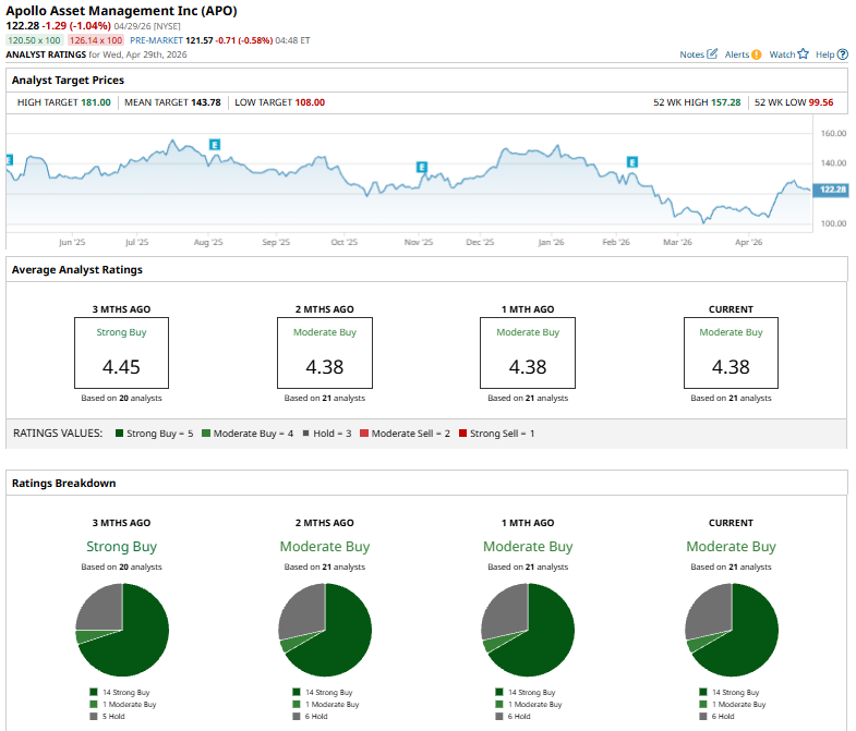Apr. 21, Michael Cyprys of Morgan Stanley lowered his price target on Apollo Global Management to $165 from $181 while maintaining an “Overweight” rating. Ahead of Q1 results, he cut EPS estimates by about 9% but still expects the firm to come in slightly above consensus across its alternative asset manager coverage.