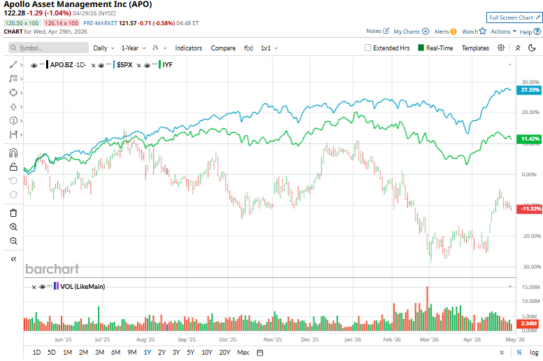 Apollo Asset Management has struggled to keep pace with the broader market. APO stock has plunged 11.1% over the past 52 weeks and dipped 15.5% in 2026, compared to the S&P 500 Index’s ($SPX) 28.3% surge and 4.2% rally, respectively.