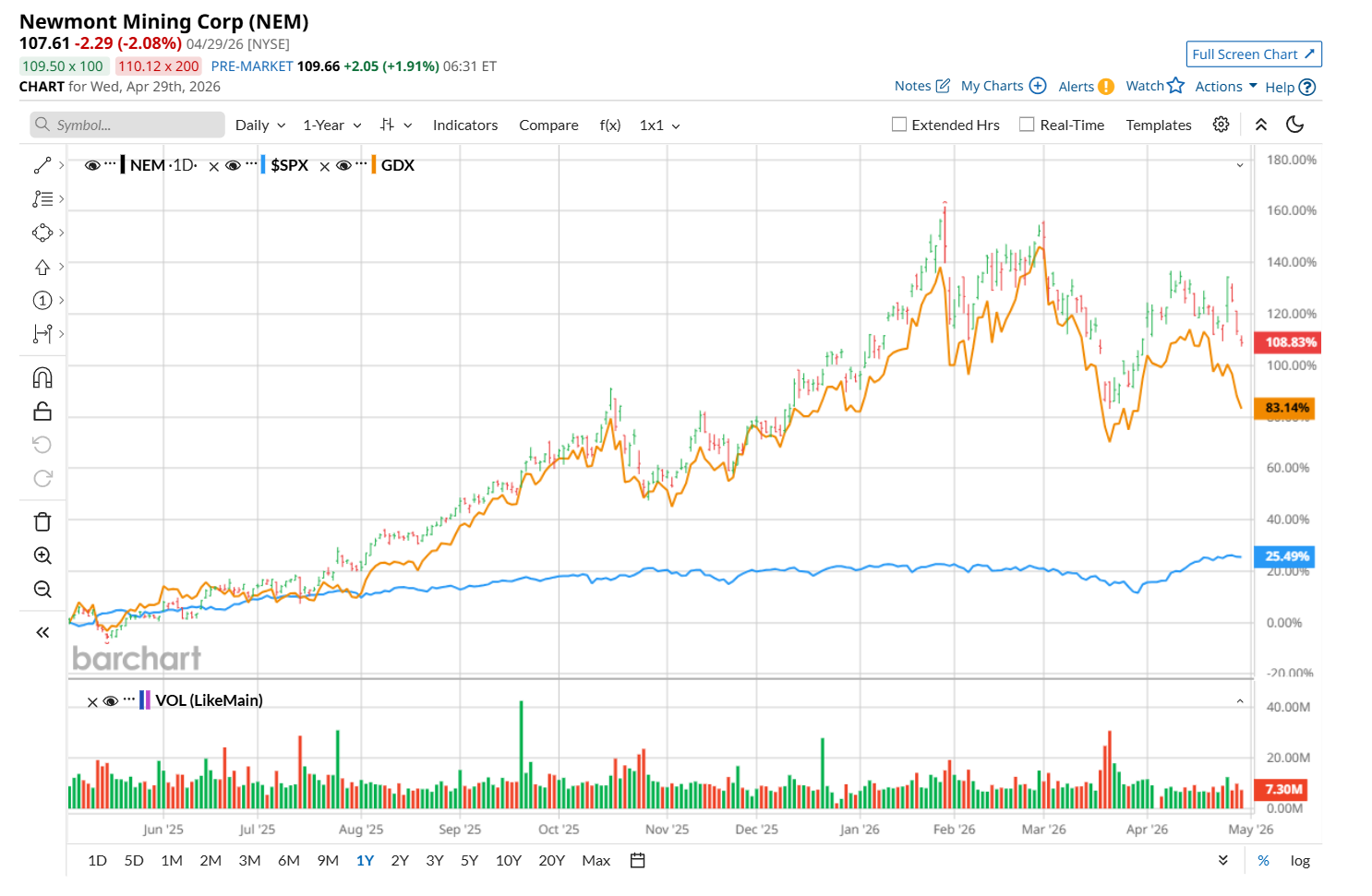 Zooming in further, NEM has also notably outpaced the VanEck Gold Miners ETF (GDX), which rose 77.9% over the past 52 weeks and increased marginally on a YTD basis.
