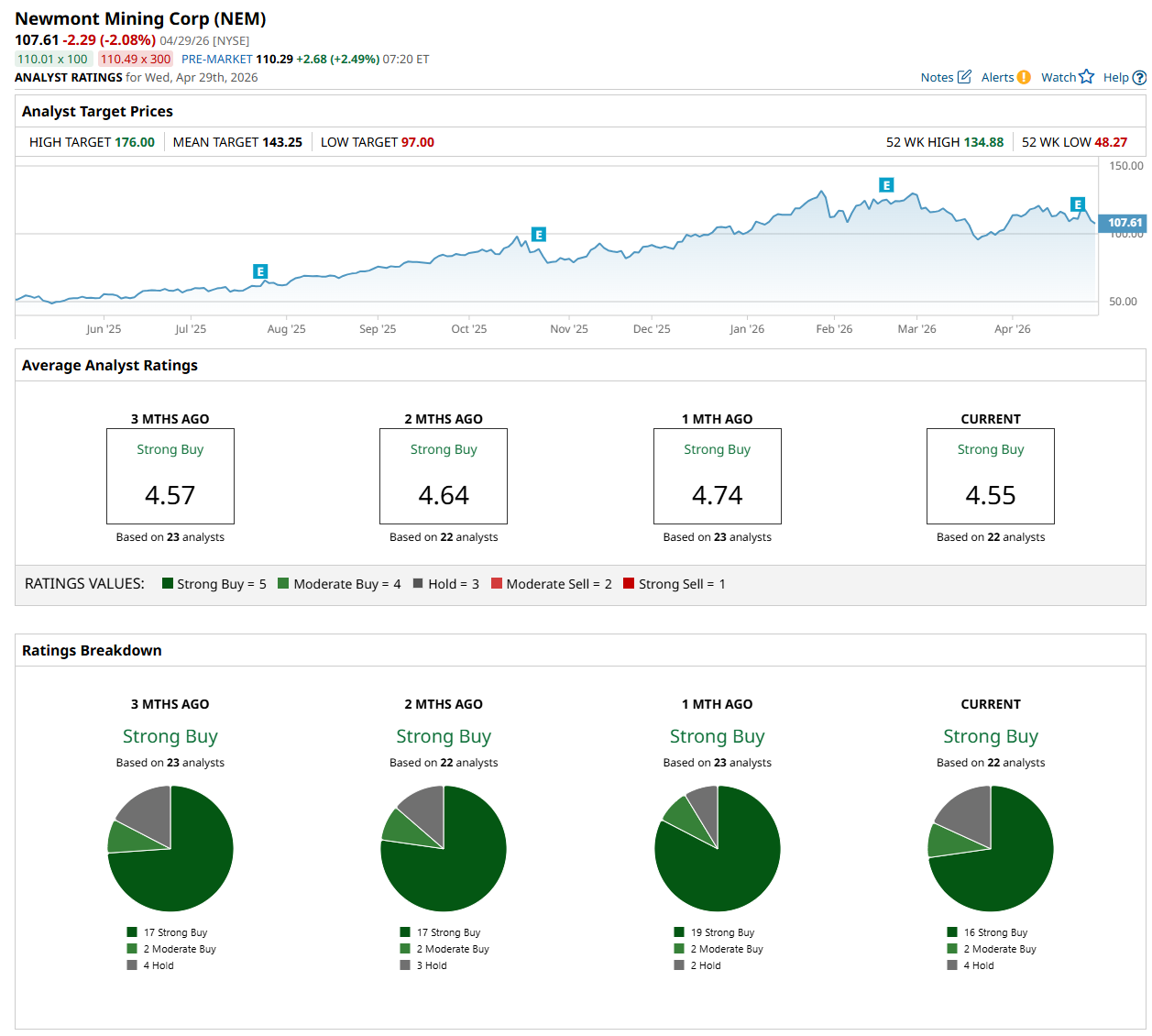 On Apr. 29, The Goldman Sachs Group, Inc. (GS) analyst Hugo Nicolaci maintained a “Buy” rating on NEM and set a price target of $125.10, indicating a 16.3% potential upside from the current price levels.