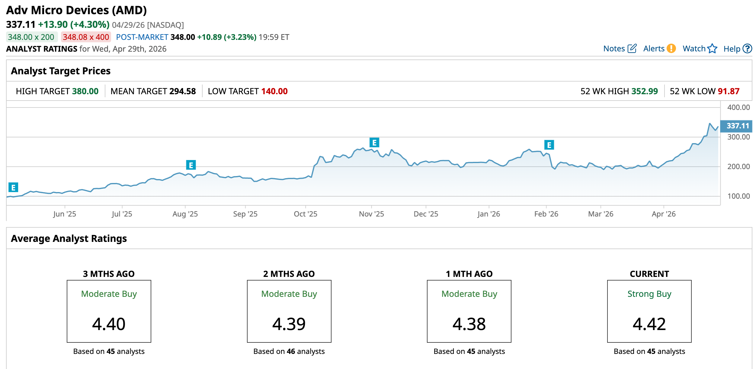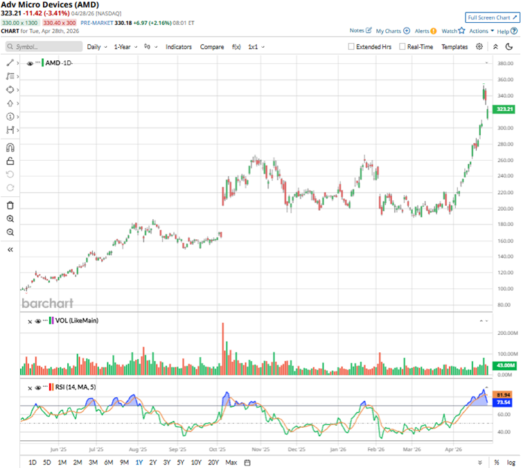 AMD’s stock surged 250.94% over the past 52 weeks on explosive AI GPU demand, deals with OpenAI and Oracle (ORCL), and data center revenue surging to power hyperscale training. The stock is also up 57.41% year-to-date (YTD). It reached a 52-week high of $352.99 on April 24, but is down 4.5% from that level.