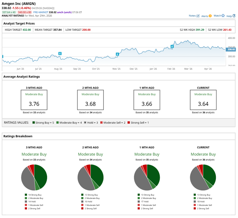 Among the 36 analysts covering AMGN stock, the consensus is a “Moderate Buy.” That’s based on 13 “Strong Buy” ratings, two “Moderate Buys,” 18 “Holds,” one “Moderate Sell,” and two “Strong Sells.”