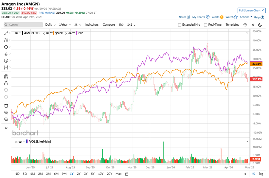 Shares of this drug manufacturing giant have underperformed the broader market over the past year. AMGN has gained 17.1% over this time frame, while the broader S&P 500 Index ($SPX) has rallied nearly 28.3%. In 2026, AMGN stock is up 3.3%, compared to the SPX’s 4.2% rise on a YTD basis.