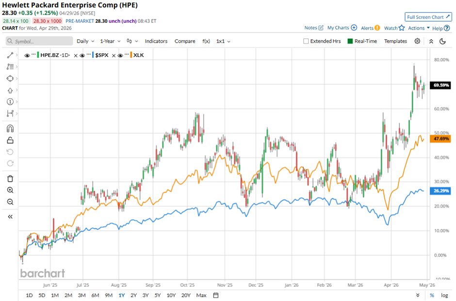 Shares of the Spring, Texas-based company have exceeded the broader market over the past 52 weeks. HPE stock has surged around 75% over this time frame, while the broader S&P 500 Index ($SPX) has risen 28.3%. In addition, shares of the company have increased 18.2% on a YTD basis, compared to SPX's 4.2% gain.