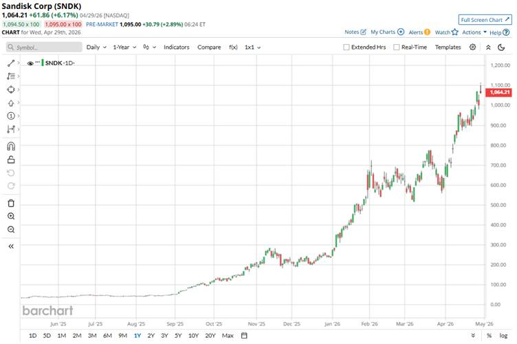 What’s notable is that this isn’t just a legacy run, it’s still accelerating. In recent sessions, SNDK has gained 17.44% over the past five days and hit a high of $1,103 on April 29, supported by strong read-through from peers like Seagate Technology, whose earnings reinforced the strength of AI-driven storage demand.