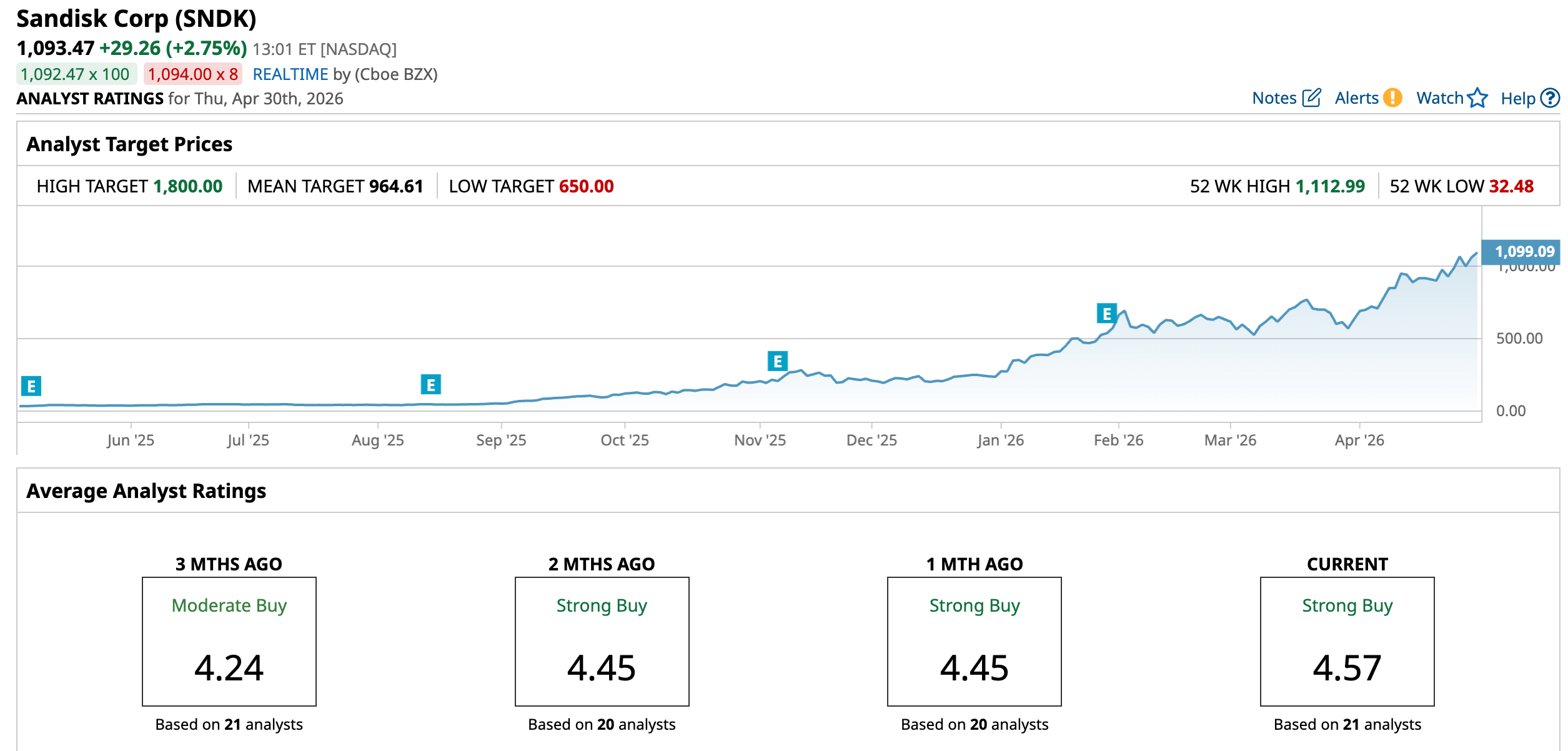 SNDK has already surged past its average analyst price target of $964.61, while the Street-high target price of $1,800 suggests that the stock could rally as much as 64.6%.