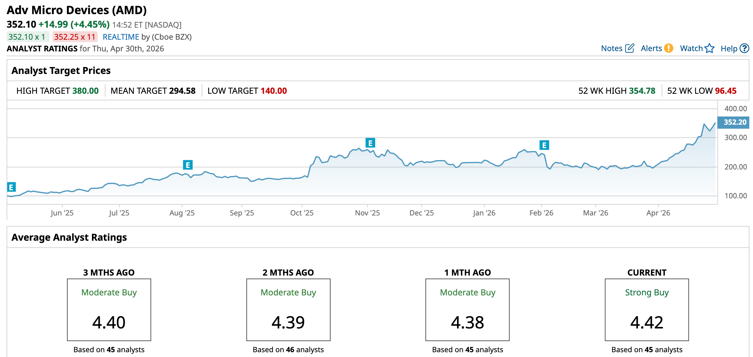 The stock already trades well above the average analyst price target of $294.58. Meanwhile, the Street-High target of $380 still leaves 7.9% upside on the table from current levels, telling the market in plain terms that the optimism fueling AMD's AI driven growth story carries plenty of room to stretch its legs further.