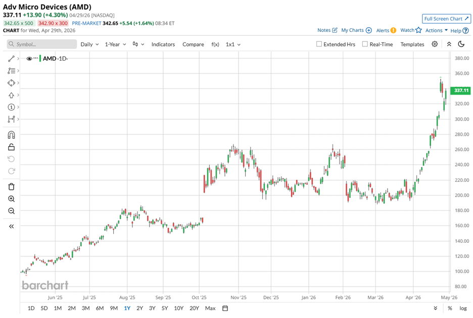 The stock has put on a masterclass in wealth creation over the past 52 weeks, barreling ahead by 262.9% and showing absolutely no appetite for slowing down. The same energy carried straight into 2026, with Advanced Micro’s shares notching a 64.96% gain year-to-date (YTD) and stacking on a further 80.2% over just the past month.