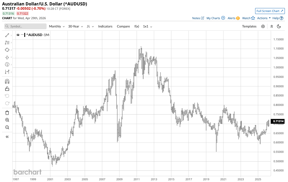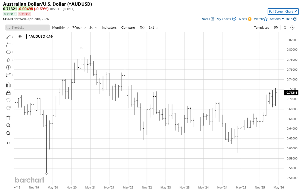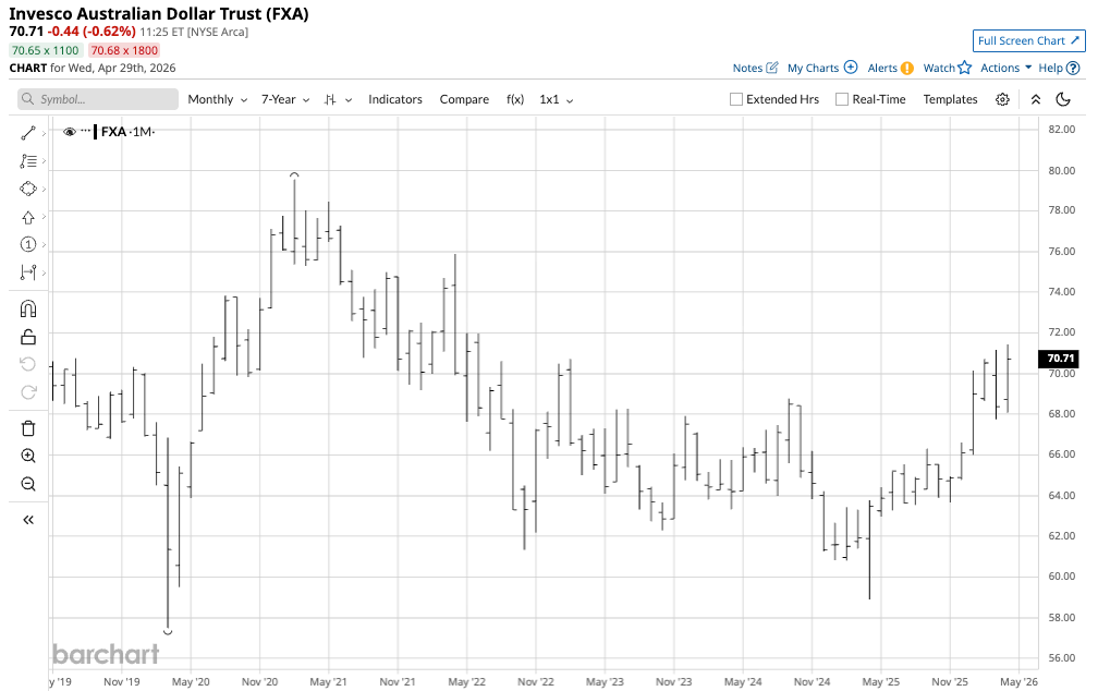 The monthly chart shows that FXA rallied 21.3% from the April 2025 $58.90 low to the most recent high of $71.44 per share in April 2026. FXA does an excellent job tracking the currency relationship. However, the ETF’s one drawback is that it only trades during U.S. stock market hours, while the A$-U.S.$ currency pair trades around the clock. FXA can miss highs or lows when the stock market is closed.