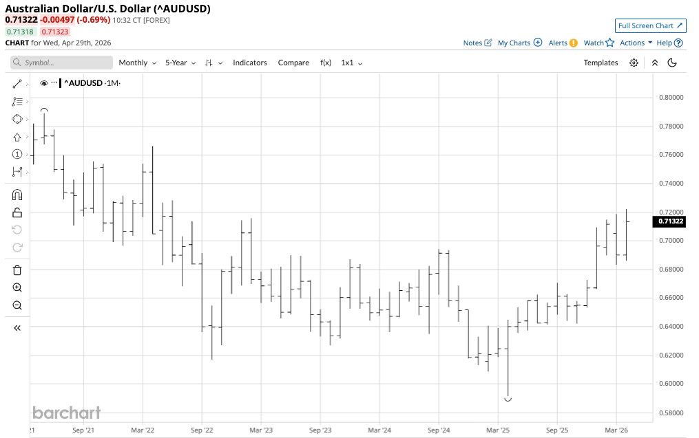 The chart shows the A$ broke above the pattern of lower highs after surpassing the September 2024 high of $0.69418 and the February 2023 high of $0.71578. In April 2026, the currency relationship rose to a high of $0.72216, the highest level since June 2022, a 22% rally from the April 2025 low.