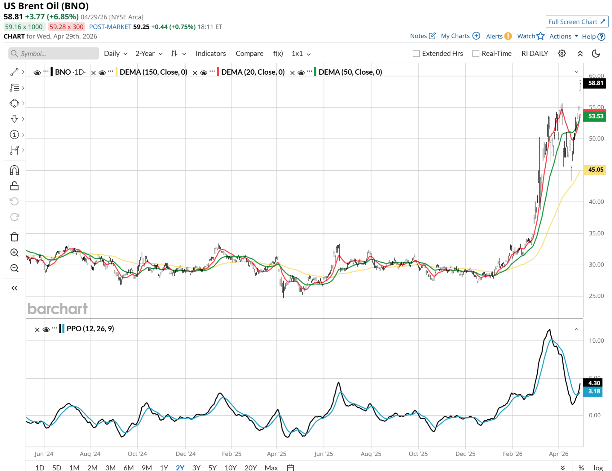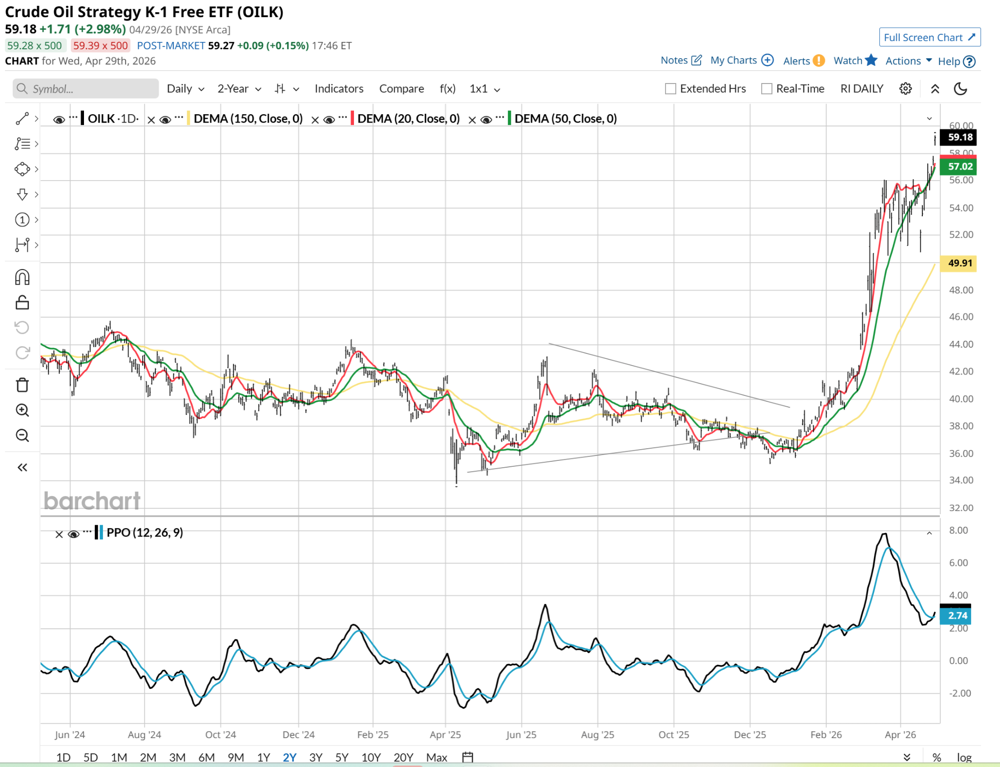 First is the ProShares K-1 Free Crude Oil ETF (OILK), and like BNO above, it just broke out again. The political football situation with the Iran War aside, we’ve already seen how fiercely this can rally. And while I’m usually not a card-carrying member of the “chase that ETF higher” club, this is not really about technicals. It is about the denouement in the Middle East.