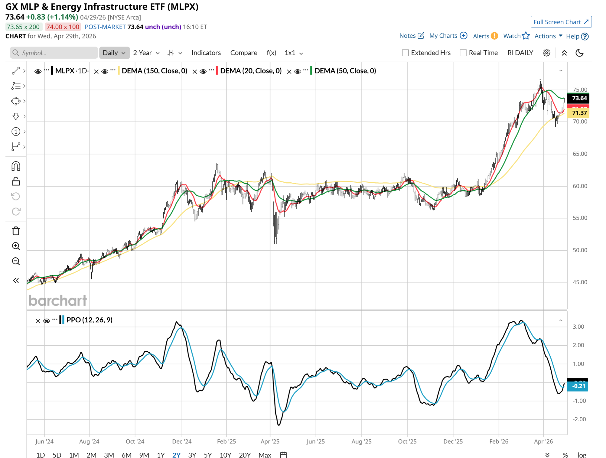 As with OILK above, which has its own “no-K1” tax advantage, MLPX’s chart exhibits a positive sign when it comes to the percentage price oscillator (PPO) indicator at bottom. It just crossed over to the upside. If you look at similar formations in the chart, this has historically produced some decent trading gains.