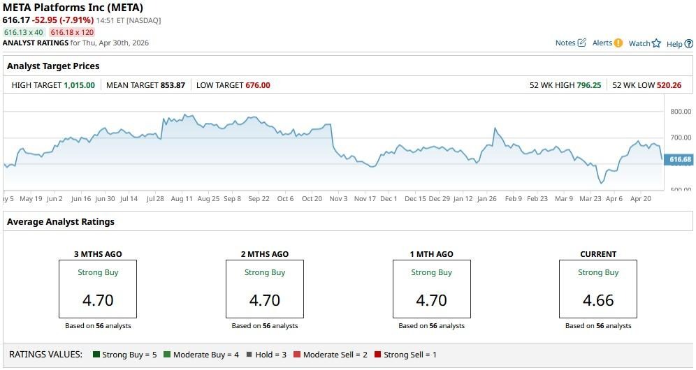 According to Barchart, the consensus rating on META shares remains at “Strong Buy,” with the mean price target of about $854 indicating potential upside of more than 40% from current levels.