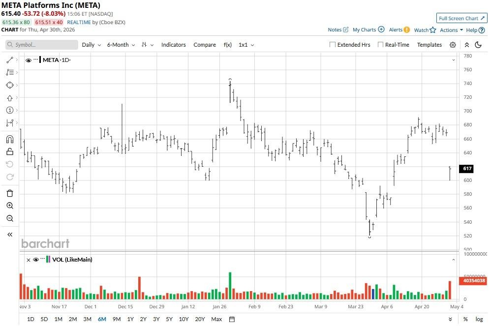 Following today’s decline, META stock is in the red again for the year, down about 5% versus the start of 2026.