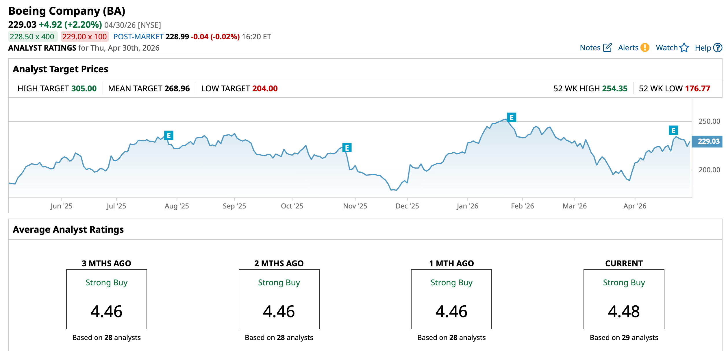 Of the 29 analysts covering the Boeing stock, 21 have a “Strong Buy” rating, three have a “Moderate Buy” rating, four have a “Hold” rating, and one has a “Strong Sell” rating. The mean target price of $268.96 implies 17.4% potential upside from current levels. Meanwhile, the high-end target of $305 implies as much as 17.4% possible growth from here.