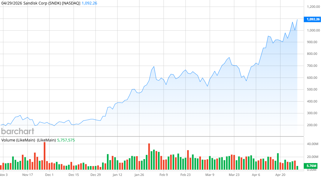 The stock’s run-up in 2026 continues a recent hot streak. Since resuming trading as SanDisk on Feb. 24, 2025, SNDK stock is up more than 2,100%.