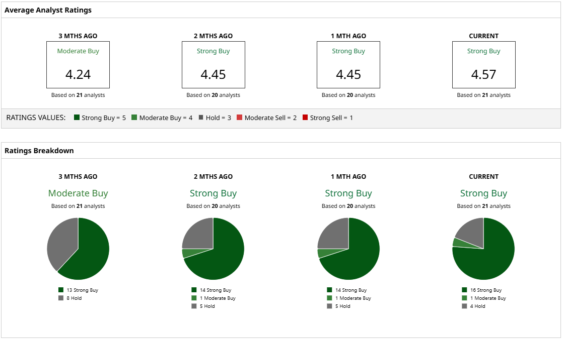 Based on 21 analysts who cover SNDK stock, SanDisk has a consensus “Strong Buy” rating. That consensus breaks down to 16 “Strong Buy” recommendations, one ”Moderate Buy," and four “Hold” ratings.