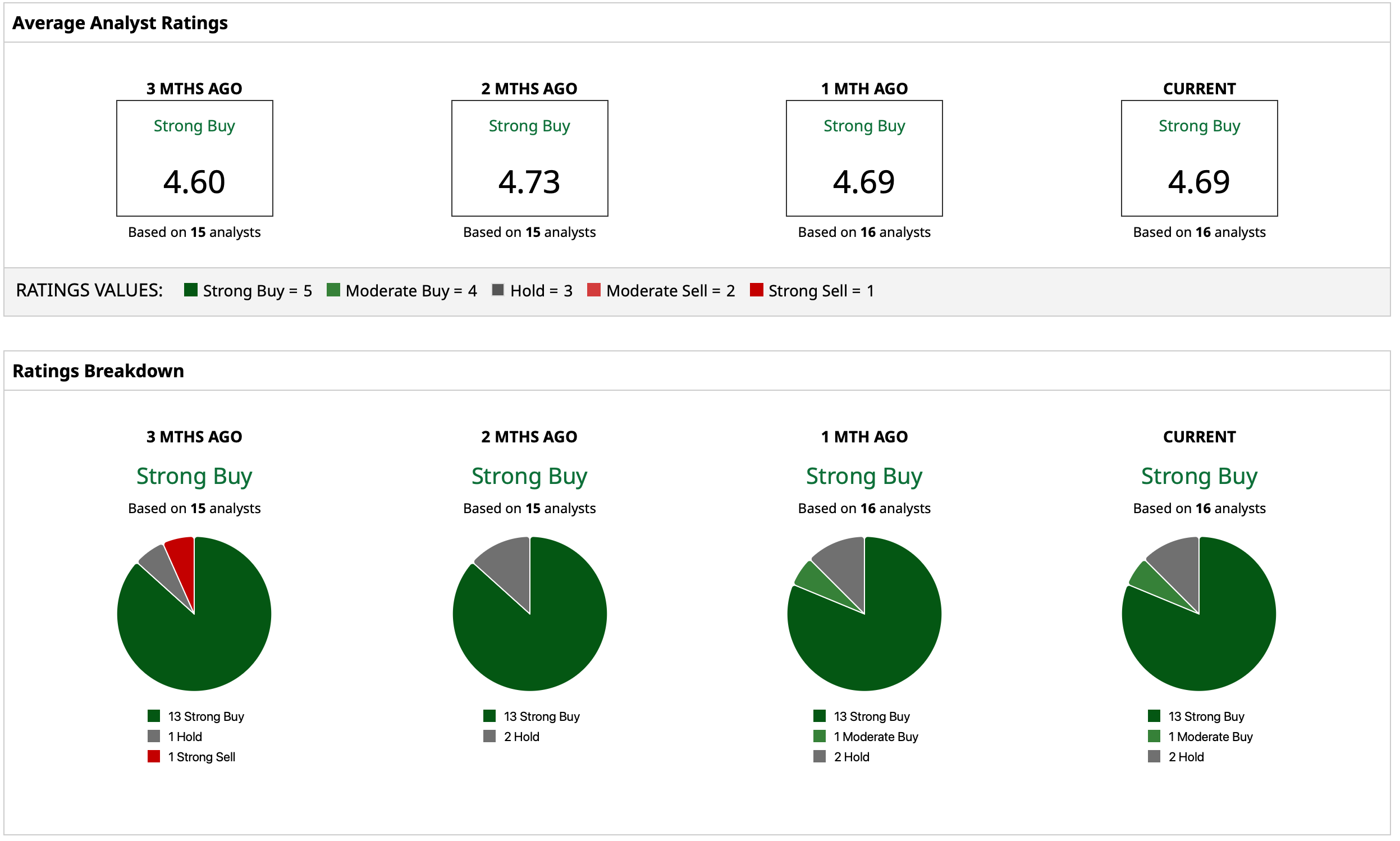 Overall, analysts give MSTR stock a “Strong Buy” conesensus rating with a mean target price of $401.86. This indicates potential upside of about 221% from current levels. Out of 16 analysts covering the stock, 13 have a “Strong Buy” rating, one has a “Moderate Buy” rating, and two have a “Hold” rating.
