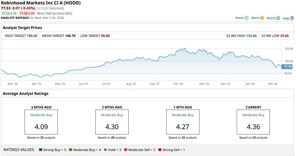 According to Barchart, the consensus rating on Robinhood remains at “Moderate Buy,” with the mean target of about $147 indicating potential upside of more than 87% from current levels.