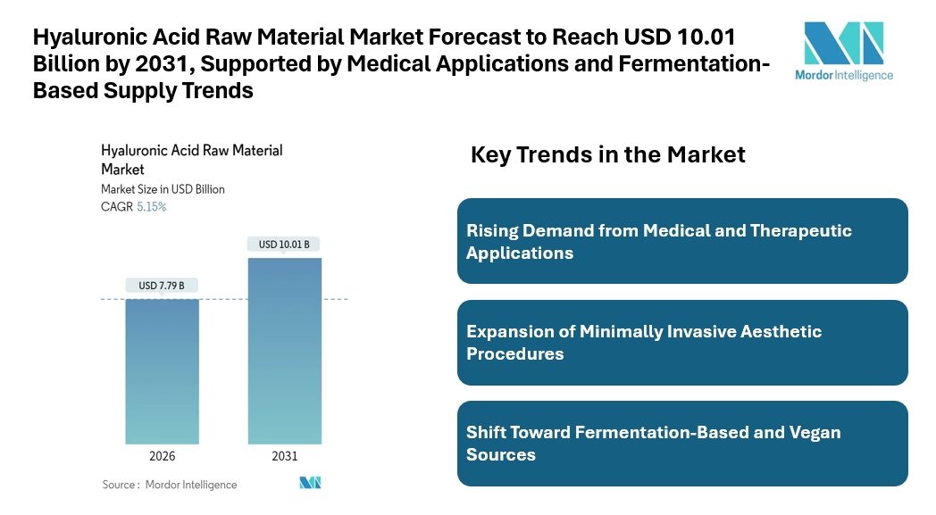 According to Mordor Intelligence, the hyaluronic acid raw material market size was valued at USD 7.79 billion in 2026 , reaching USD 10.01 billion by 2031. This growth outlook reflects the increasing reliance on hyaluronic acid as a functional raw material rather than a purely cosmetic ingredient.