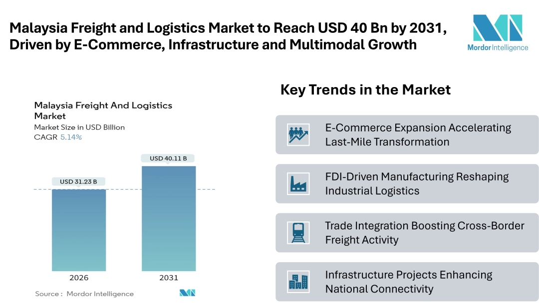 According to Mordor Intelligence, the Malaysia freight and logistics market size is on a steady growth trajectory, expanding from USD 29.70 billion in 2025 to USD 31.23 billion in 2026, and projected to reach USD 40.11 billion by 2031, advancing at a 5.14% CAGR between 2026 and 2031. This growth is reinforced by the country’s rising prominence as a regional trade gateway, supported by Port Klang’s global standing and sustained government investment in rail links and highway infrastructure. These developments are strengthening multimodal connectivity and reshaping national supply-chain networks.